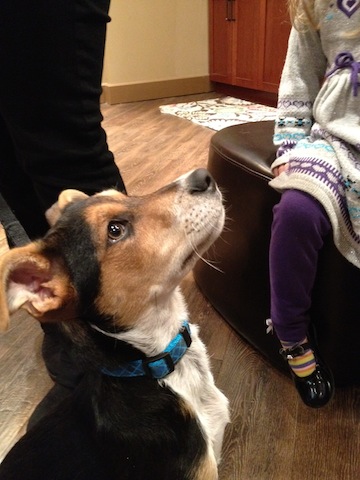 We have been in there before with no specific reason except to let the girls play with the dogs, cats, rabbits and guinea pigs, but this time I connected with a puppy and made the snap decision to adopt him. He is a beagle mix (they say Austalian Shephard, we think terrier), 3-4 months old. We have lost three pets in the last few months and our dog is getting older. A puppy will take us through our kids graduating from high school.